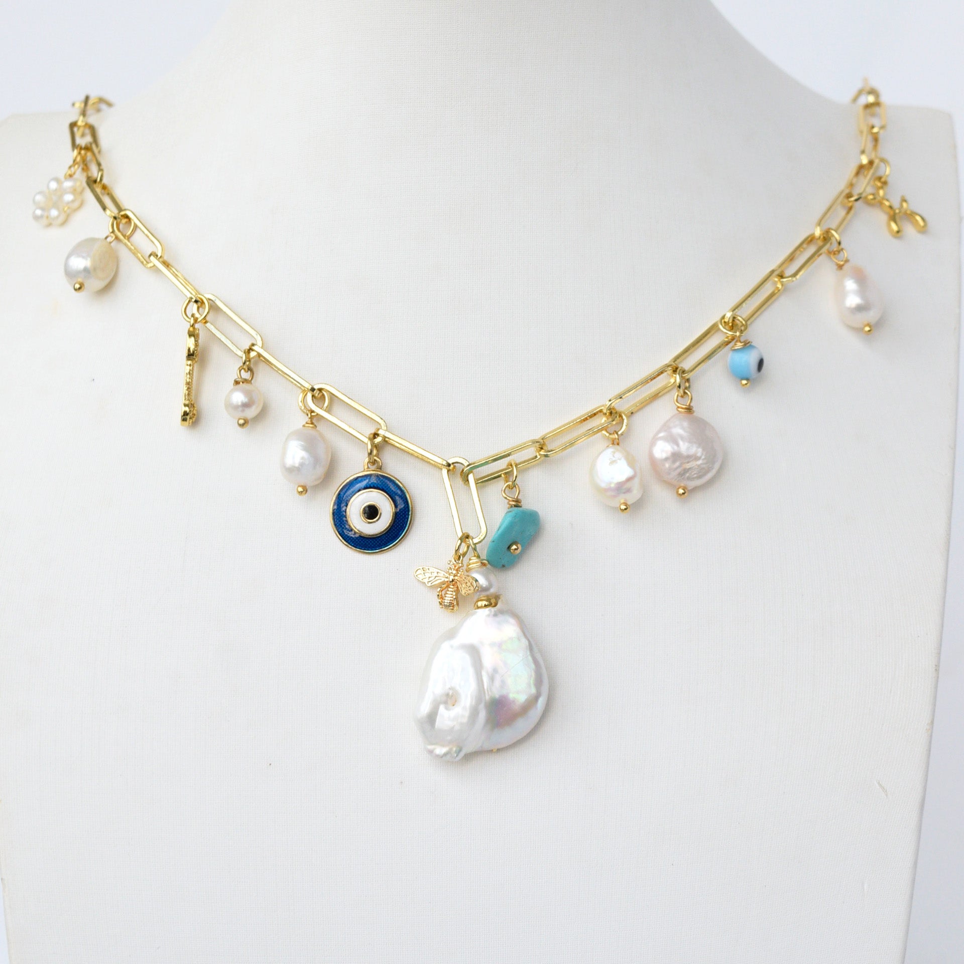 - Paperclip grande con charms de perlas, ojito, turquesa y perla barroca grande en el medio